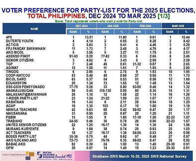 Ito ay batay sa resulta ng Pre-Election Survey ng Social Weather Station (SWS) na isinagawa sa apat (4) na buwang sunud-sunod mula December 2024 hanggang March 2025.