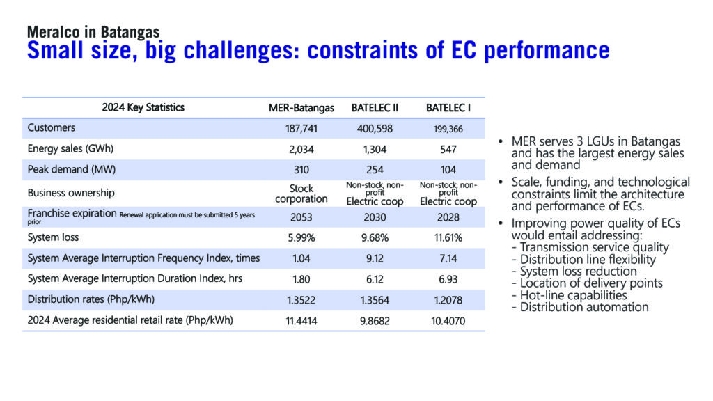In 2024, BATELEC I and BATELEC II recorded system losses of 11.61% and 9.68% respectively, in stark contrast to Meralco’s 5.99%. In terms of service reliability, Meralco posted a System Average Interruption Frequency Index (SAIFI) of only 1.04, compared to 9.12 for BATELEC II and 7.14 for BATELEC I.