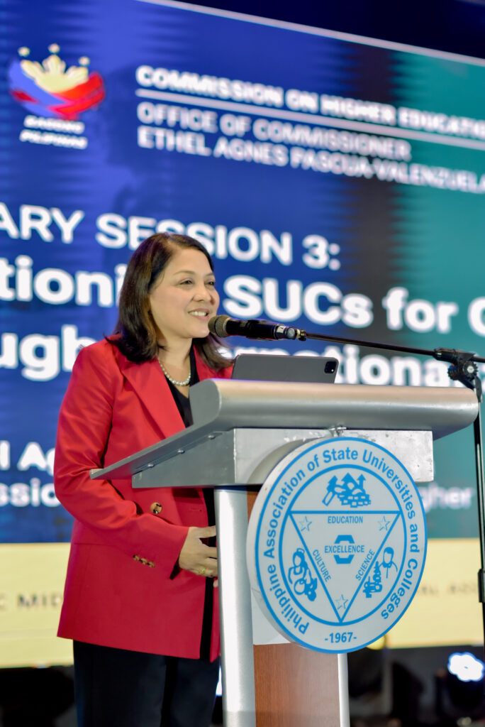 In the following plenary, CHED Commissioner Dr. Ethel Agnes P. Valenzuela emphasized the urgency of preparing SUCs for global competitiveness through internationalization and sustainability. She urged SUCs to embrace digital credentials, cross-border partnerships, and SDG-aligned programs as essential tools for building future-ready institutions.