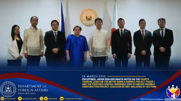 MANILA — Secretary of Foreign Affairs Ma. Theresa P. Lazaro and Ambassador ENDO Kazuya of the Embassy of Japan signed and exchanged diplomatic notes for the fourth tranche of the Metro Manila Subway Project (MMSP) Phase 1 and Central Mindanao High Standard Highway (Cagayan de Oro–Malaybalay Section) on Friday, March 27, 2026, at the Department of Foreign Affairs (DFA).