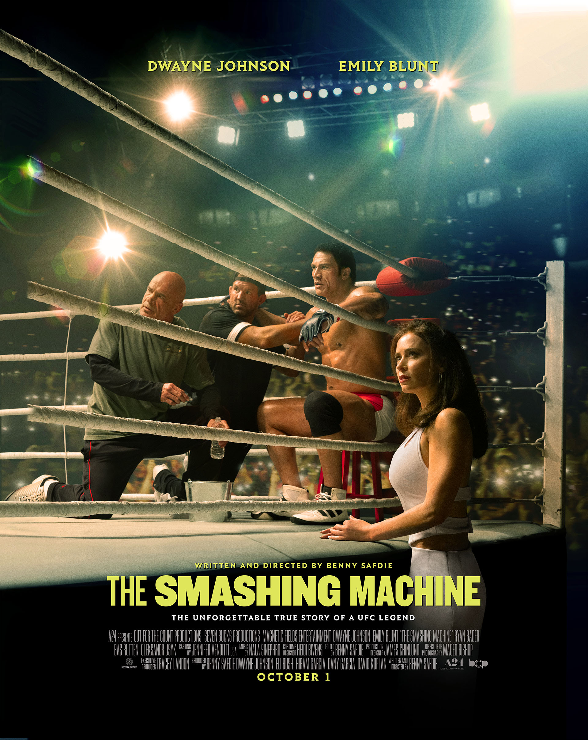 The Smashing Machine brings to life the story of Mark Kerr, the legendary mixed martial artist whose reign in the late 1990s earned him the nickname that gives the film its title. Portrayed by Dwayne Johnson in one of the most transformative roles of his career, Kerr’s dominance in the UFC and PRIDE Fighting Championships is set against the backdrop of addiction, personal struggles, and the crushing pressures of fame. Emily Blunt stars as Dawn Staples-Kerr, whose turbulent relationship with Kerr adds depth and intimacy to the narrative. Under the vision of Benny Safdie in his solo directorial debut, the film delivers a raw and unflinching portrait, not only of a fighter at his peak but of the emotional battles that test the limits of strength, love, and resilience.
