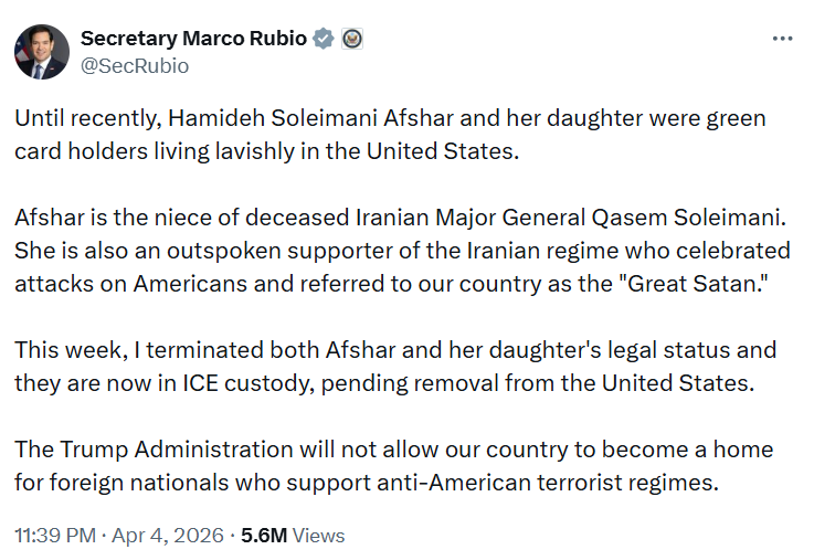 The United States State Department announced on Saturday, April 4, 2026, that the niece and grand-niece of the late Iranian Revolutionary Guard Corps Commander, Gen. Qasem Soleimani, have been arrested and are facing removal from the country. According to a statement released by Secretary of State Marco Rubio, the lawful U.S. permanent resident status of Hamideh Soleimani Afshar and her daughter has been officially revoked.